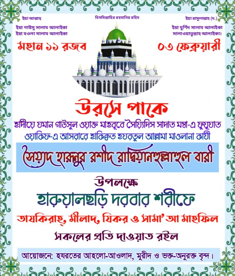 সকলের প্রতি আন্তরিক মোবারকবাদ এবং আগামী ১১ রজব ০৩ ফেব্রুয়ারী শুক্রবার হারুয়ালছড়ি দরবার শরীফে উরসে পাকে হাদীয়ে যমান (রাদ্বি.) উপলক্ষে দাওয়াত রইল।